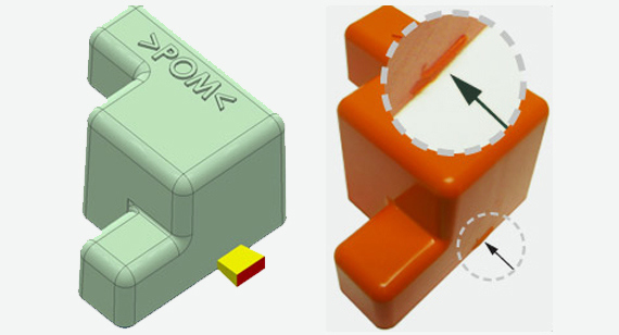 Figure 1: The yellow block on the left shows the size and shape of the tab gate, which can be moved to various locations on the part. The molded part on the right displays a rectangular blemish where the gate was placed.