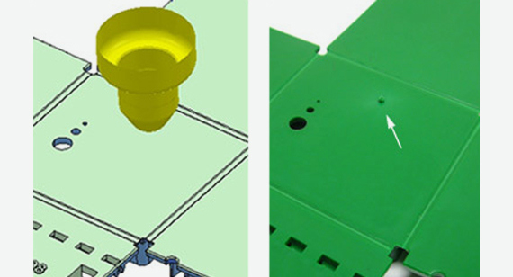 Sub gates typically incorporate a tunnel gate into the side of the part or an ejector pin (post gate). Both styles tend to leave smaller vestiges on the part’s exterior. Tunnel gates enter the part externally, midway down its surface, leaving less of a gate vestige. Post gates fill the part through an ejector pin close to the perimeter, leaving no visible vestige on the exterior. However, they may leave a cosmetic shadow on the opposite side due to heat and part thickness, so caution is advised for highly cosmetic parts with texture or high polish.