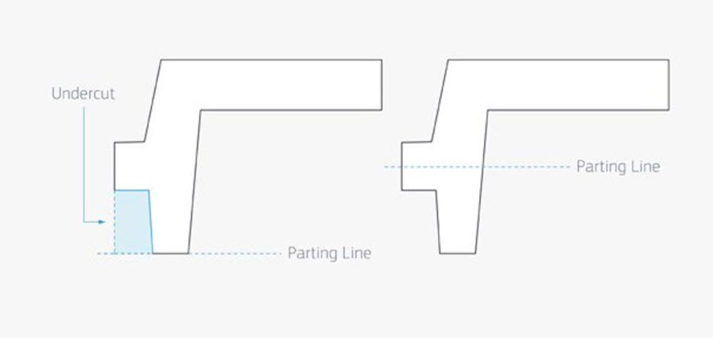 Undercuts, such as those shown, can complicate and, in some cases, prevent part ejection, so eliminate them if possible.